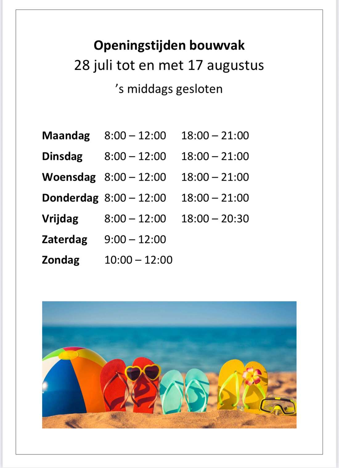let op, tijdens de bouwvak aangepaste openingstijden. Zie kopje nieuws voor de tijden.